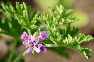 バラのような香りがすることから名付けられたゼラニウムの一種です。甘く上品な香りは、気分を明るく、ストレスや不安を和らげる効果が期待されています。初夏にはピンクの花を咲かせ、その見た目も楽しめます。